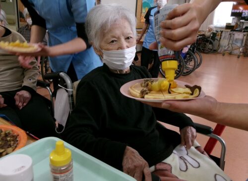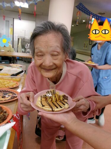 お好みのトッピングをしたホットケーキを持って皆さんニッコリ☺